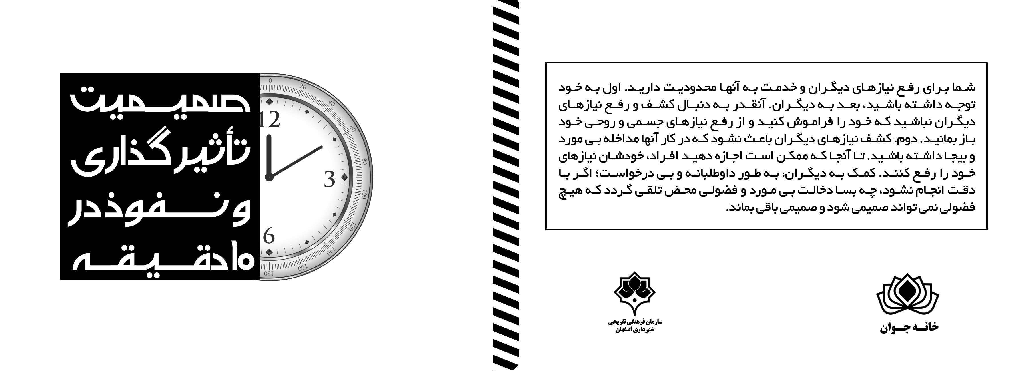 خانه جوان جزوه ای با عنوان صمیمیت ، تأثیر گذاری و نفوذ در 10 دقیقه را آماده کرده است. این جزوه خلاصه از سیوه های جذاب برقراری ارتباط را عنوان می کند. برای دریافت جزوه        می توانید به امور فرهنگی خانه جوان مراجعه نمایید.